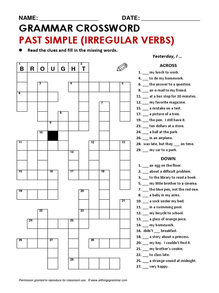Browse Printable Past Tense Verb Worksheets | Education.com VerkkoPast Tense Verb Crossword Puzzle. Word puzzles are an effective and entertaining way to practice irregular past tense verbs with your students. Let your budding wordsmiths have fun reviewing those tricky past tense verbs with this crossword puzzle! 2nd grade. Reading & Writing.