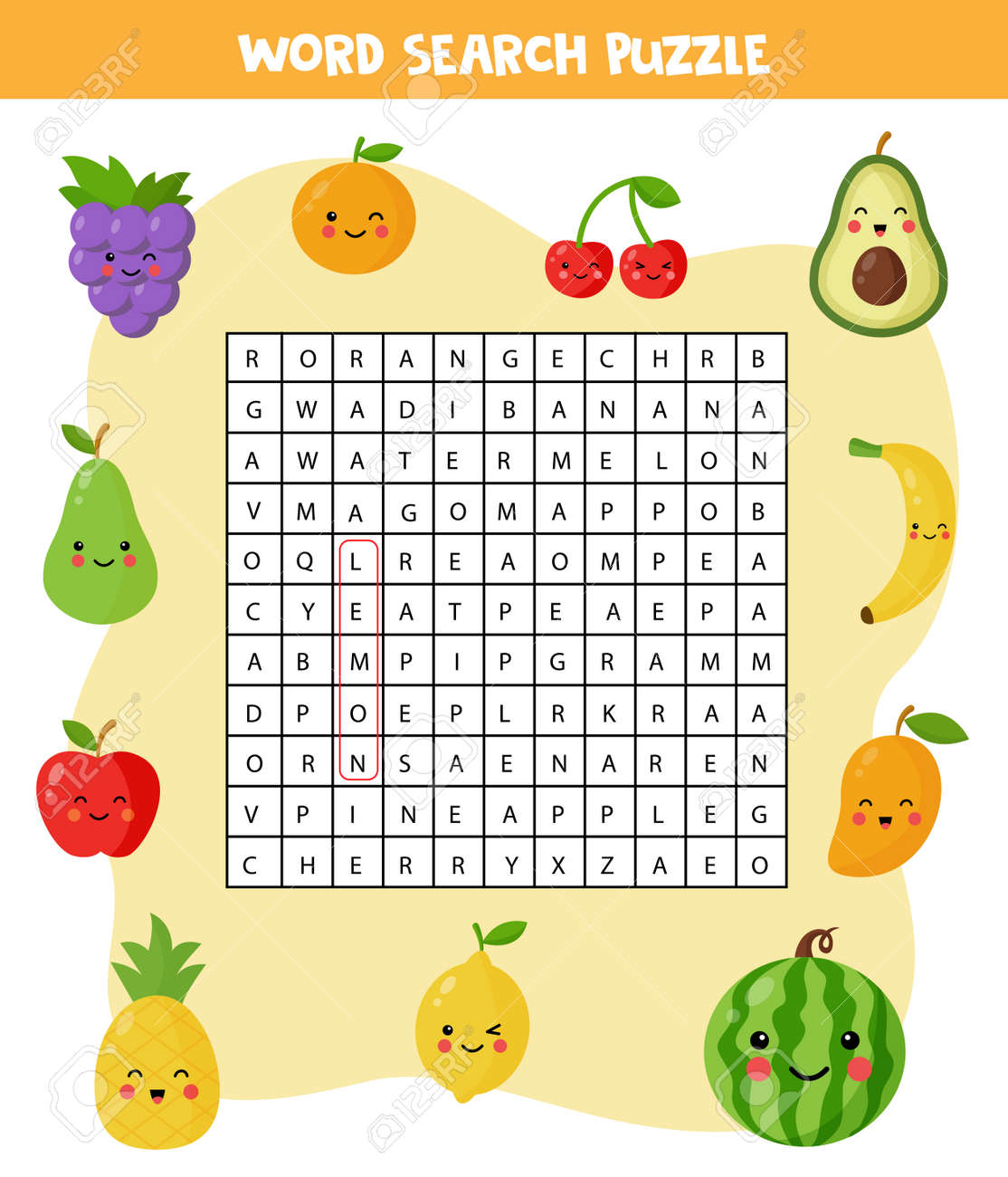 Words Search Puzzle For Children. Set Of Colorful Fruits ...